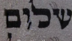 Image of the Hebrew word shalom as appearing in a Torah scroll with a break in the letter Vav, accessed at https://www.sofer.co.uk/broken-vav on July 19, 2022.